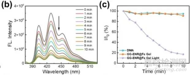 如圖11所示,DMA的熒光光譜1min檢測一次,結果顯示GG-ENR@Fe凝膠組的熒光強度相較于其他組有顯著降低,表明GG-ENR@Fe凝膠具有通過光動力療法(PDT)產生單線態氧(1O2)的能力,這可能使其在抗菌治療中發揮重要作用(圖11c)。