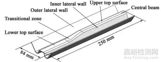 目標零件為W 型汽車防撞梁特征件,三維模型和尺寸如圖2 所示,該零件截面呈W 型,主要分為中梁、外側壁和內側壁3 部分,并且在寬度方向沿中心面左右對稱。中梁的上頂面和下頂面通過過渡區連接,過渡區、內側壁和上頂面的交界處具有小圓角特征,圓弧半徑為3 mm,在常溫下沖壓時該區域容易發生開裂。