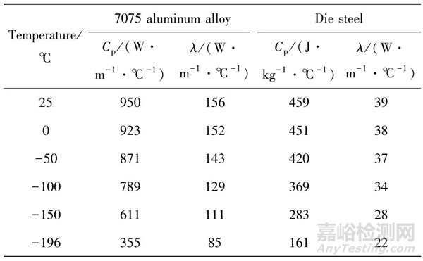 表1 7075 鋁合金和模具鋼的熱物性參數[8]