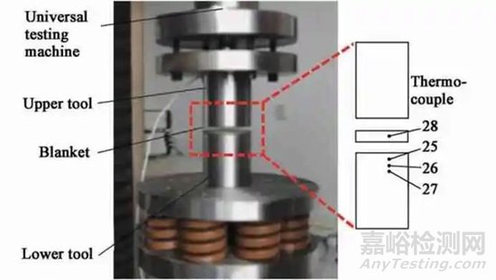 基于超低溫沖壓工況,在Zwick 電子萬能試驗機上搭建了超低溫界面熱傳導系數測試裝置,如圖6 所示,主要包括上、下圓臺模具、半徑為35 mm的圓片試樣、液氮容器、4 個直徑為Φ1 mm 的探針式T 型熱電偶、KEITHLEY7708 數據采集器和后處理電腦。設計圓臺實驗模具使熱量主要沿軸向傳遞,盡可能滿足一維熱傳導假設。圓片試樣側面開有直徑為Φ1 mm,深度為15 mm 的盲孔,用于固定熱電偶,對于薄板而言,板料厚向上的溫度梯度可以忽略,即認為熱電偶測試的溫度為板料表面溫度。在下模具內部距離上表面2、6 和10 mm 位置處分別安裝3 個熱電偶。實際測試時,先將圓片試樣在液氮容器中浸泡15 min,然后快速轉運到下圓臺模具,同時啟動試驗機通過上夾頭帶動上圓臺模具以20 mm·s-1 的速度下行,達到設定壓力時停止并保壓,在板料溫度恢復至室溫后取下板料,完成測試。通過數據采集器記錄模具和板料對應位置的溫度變化歷史,數據點分別為25、26、27 和28。實驗中,設置界面壓力分別為0.5、5 和10 kN。