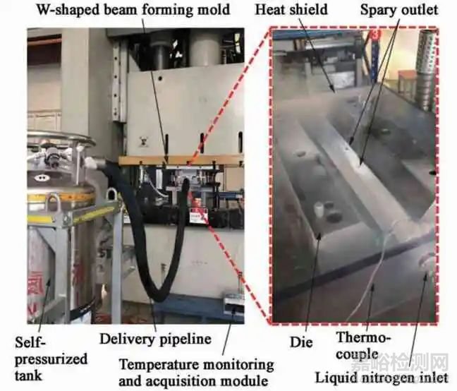 在300 t 小松伺服壓機上搭建了W 型汽車防撞梁的超低溫沖壓實驗平臺,如圖7 所示,該平臺包括沖壓模具、自增壓液氮罐、液氮輸送管、隔熱防護罩和溫度采集模塊等。在W 型防撞梁冷沖壓模具上開通額外的流道,位置在下模具中部,形狀為圓孔貫通型。使用相對經濟的液氮作為冷卻介質,自增壓液氮罐通過輸送管向模具中運送液氮,實現模具降溫。同時考慮到防撞梁特征件的主要變形區在零件的中部區域,因而在下模具對應位置鉆通兩個圓孔,使流道中的一部分液氮從中間的小口直接噴淋到板料上,達到板料局部降溫的效果。此外,由于沖壓過程在開放空間進行,為了實現更低的成形溫度,使用亞克力材質的隔熱防護罩包裹上模具和下模具,減少板料和模具在空氣中的散熱。