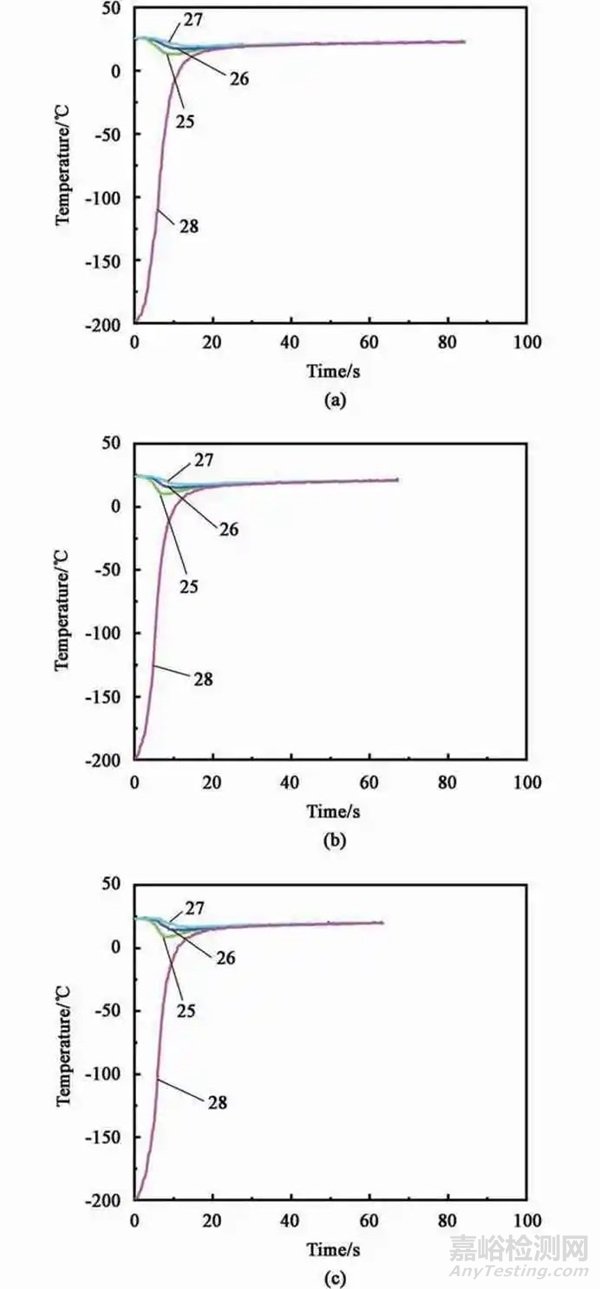 根據施加載荷和接觸面積的比值計算得到接觸壓力分別為0.13、1.3 和2.6 MPa,不同接觸壓力下板料和模具溫度變化歷史如圖9 所示,板料轉運到模具后,模具溫度開始下降,板料溫度從-196 ℃上升到約為-170 ℃。在圓臺模具對板料施加壓力后,板料的溫度呈快速上升趨勢,表明存在接觸壓力時板料和模具以極快的速度進行熱交換。當板料溫度到接近0 ℃時上升速度明顯減緩,模具上最靠近表面的25 號測點從室溫降低到8 ℃,而距離表面更遠的26、27 號測點的最低溫度分別為14 和17 ℃。在上模具壓住板料約20 s 后,所有測點的溫度都穩定在20 ℃左右。對比不同載荷下的結果,各個測點溫度都具有相同的變化趨勢。