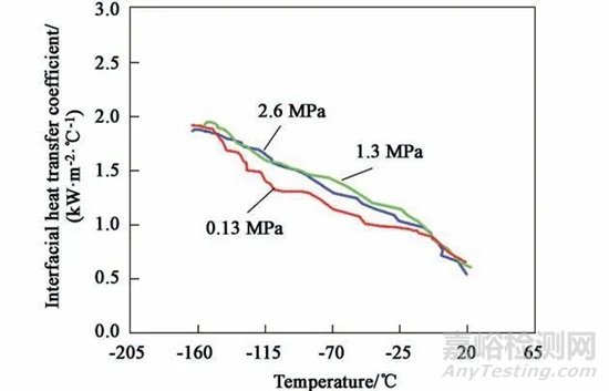 不同接觸壓力下超低溫界面熱傳導系數的識別結果如圖10 所示。隨著溫度降低,界面熱傳導系數逐漸增大,到-165 ℃時接近2 kW·m-2·℃-1。而隨著接觸壓力的增大,界面熱傳導系數增大趨勢不明顯,表明超低溫下接觸壓力對界面熱傳導系數影響較小。