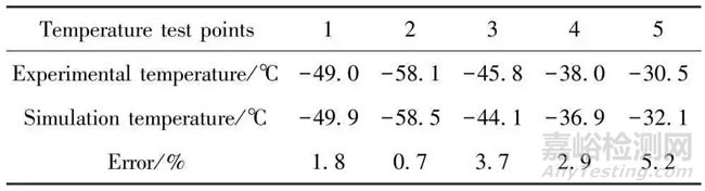 在進行液氮制冷后模具的溫度場分布如圖11 所示。從圖中可知,下模具的表面溫度呈梯度分布,中部溫度低,兩邊溫度高,從液氮入口到出口的溫度逐漸升高,在靠近液氮入口處溫度最低,為-58.9 ℃ (箭頭所示),出口處溫度約為-30.4 ℃。自增壓液氮罐向模具輸送的實際是液氮和空氣的混合物質,由于液氮輸送管頭部插入模具流道入口,輸送的液氮與測點2 附近的流道最先接觸,使該位置附近溫度最低。隨后,液氮與模具之間的熱交換使冷卻介質中液氮占比逐漸降低,因而靠近入口溫度低、出口溫度高。模具表面溫度的測試與仿真結果對比如表2 所示,5 個測溫點的仿真溫度與實驗測試溫度都較為接近,最大誤差為5.2%,驗證了模具溫度場仿真結果的可靠性。
