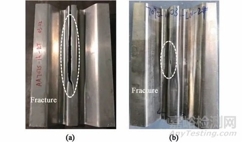 為進一步分析預時效態7075 鋁合金W 型防撞梁的成形溫度區間,分別對板料進行室溫沖壓以及經過液氮浸泡后的沖壓實驗,得到的零件如圖16 所示。由圖可知,室溫下成形的零件直接破裂,而液氮浸泡后板料在成形時依舊在小圓角特征區域出現短裂紋,從圖13 的溫度變化結果可知,如果沒有進行液氮噴淋補溫,成形時的溫度接近-150 ℃,此時仍無法得到完整的零件。因此,在超低溫成形時,W 型零件的小圓角關鍵過渡區域需要保證在足夠低的溫度下發生變形,即變形溫度低于-150 ℃,充分利用超低溫增塑效應來避免缺陷產生。