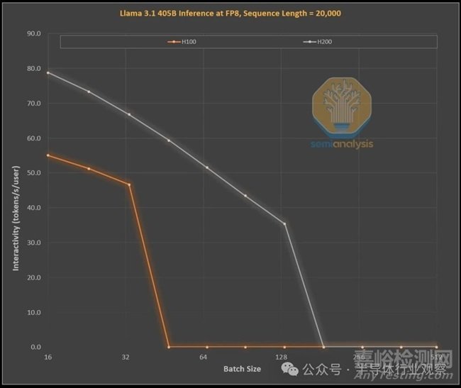 由于內存帶寬更大,所有可比批次大小的交互性普遍提高了 43%(H200 @ 4.8TB/s vs H100 @ 3.35TB/s)。