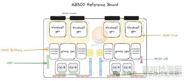 對于 GB300,Nvidia 不會提供整個 Bianca 主板,而是僅提供“SXM Puck”模塊上的 B300、BGA 封裝上的 Grace CPU 以及來自美國初創公司 Axiado 而非 GB200 的 Aspeed 的 HMC