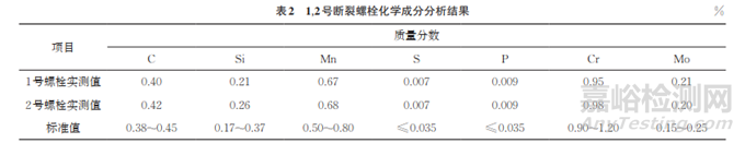 在1,2 號(hào)螺栓斷口附近截取試樣,用直讀光譜儀對(duì)試樣進(jìn)行化學(xué)成分分析,結(jié)果如表2所示。由表2可知:兩件斷裂螺栓的化學(xué)成分均符合GB/T 3077—2015對(duì)42CrMo鋼的要求。