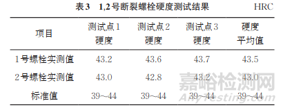 在1,2號(hào)斷裂螺栓上截取試樣,對(duì)試樣進(jìn)行洛氏硬度測(cè)試,結(jié)果如表3所示。由表3可知:斷裂螺栓的硬度符合GB/T 3098.1—2010對(duì)12.級(jí)螺栓的洛氏硬度要求,但結(jié)果接近標(biāo)準(zhǔn)要求的上限。