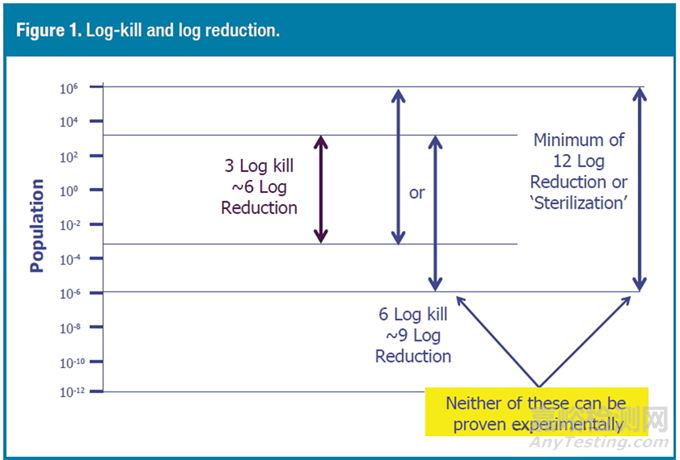 上圖取自James Agalloco的文章(汽化過氧化氫的現實世界),非常有助于闡明概念。如前所述,9個對數級的減少或12個對數級的減少都無法通過實驗測試,以實現10e-6 SAL。在滅菌的情況下,我們依靠蒸汽的滲透能力來確保達到SAL 10e-6,而對于生物凈化,假設最大生物負荷為10e3,我們應該開發一個循環,達到9個對數級的減少,使致死率達到6個對數級(或SAL 10e-6)。