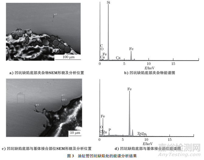 距缺陷邊部一段距離的一個疑似氧化物被基體包裹得很好,用能譜儀對該氧化物進行定性和定量檢測,結果如圖3所示。由圖3可知:該氧化物為Si、Ca、Fe 元素的復合氧化物,屬于硅酸鹽類非金屬夾雜物的一種。又對凹坑缺陷與基體毗鄰部位進行能譜分析,發現主要含有P、Zn、O、Fe元素,應該為鋼管冷拔前潤滑工序的磷化液、皂化液殘留所致。
