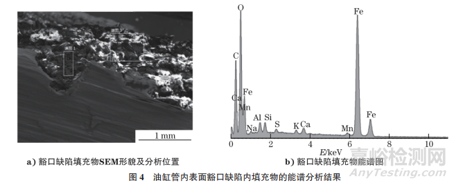 油缸管內表面不規則分布的豁口缺陷兩端呈圓鈍形態,豁口全長10~50mm,長度方向與鋼管的軸向基本一致,豁口寬度較寬,兩側與鋼管基體交界部分呈鋸齒狀,該缺陷在鋼管內表面出現的位置不固定,當用刮刀對鋼管內表面進行加工時,會在豁口處跳刀,說明豁口內明顯有異物存在。對異物進行SEM分析,結果如圖4所示。由圖4可知:異物主要由Al、Ca、Si、Mn、K、Na、Fe等元素的氧化物組成。