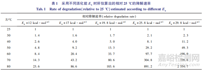 Ea實(shí)際測定需要進(jìn)行一系列復(fù)雜的工作。可采用保守和激進(jìn)的估算值對試驗(yàn)進(jìn)行預(yù)估,例如Ea采用較激進(jìn)的19.8 kcal·mol-1時(shí),當(dāng)某原料藥或制劑的加 速 試 驗(yàn) 條 件 為40℃/75%RH放置6個(gè)月(180d)時(shí),相當(dāng)于在70 ℃ 下放置11d(180d ×5.0÷80.6=11d),60 ℃ 下放置27d;當(dāng)Ea采用較為保守的17kcal·mol-1時(shí),由上表可知,加速條件40℃ /75,相當(dāng)于70℃下放置17d(180d ×4.0 ÷ 43.2=17d),60℃ 下放置35d;當(dāng)采用更加保守的Ea(12kcal·mol-1 )時(shí),相當(dāng)于70 ℃下放置33d(180d × 2.6 ÷ 14.3=33d),60℃下放置56d, 已 有 研 究 報(bào) 道 大 多 數(shù) 化 合 物 的Ea在20kcal·mol-1 以上[18],所以可采用較為激進(jìn)的Ea進(jìn)行預(yù)估。需要注意,以上不同溫度之間降解速率的換算需要基于降解反應(yīng)的濕度保持不變,因此,為了方便估算,建議高溫降解反應(yīng)的濕度保持與加速條件一致(如75% RH)。如果沒有證據(jù)表明更加劇烈的溫度會(huì)影響藥物的降解途徑,可以采用更高的溫度進(jìn)行試驗(yàn),以節(jié)省反應(yīng)的時(shí)間,以 Ea 采用18kcal·mol-1 為例,110℃下反應(yīng)16h 相當(dāng)于長期條件25℃/60%RH下放置18個(gè)月[19]。