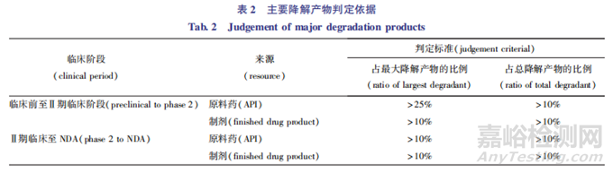 化學(xué)仿制藥的降解途徑和主要降解產(chǎn)物已有報(bào)道。 如抗流感藥物帕拉米韋注射液原研藥品的主要降解途徑/ 降解雜質(zhì)在日本PMDA審評文件中已有論述[21],其主要降解雜質(zhì)為羧基手性消旋雜質(zhì)(C-1異構(gòu)體雜質(zhì));在注射液Q1Q2一致的基礎(chǔ)上,其降解途徑應(yīng)與原研藥品基本一致,故一般無需再通過對主要降解產(chǎn)物進(jìn)行歸屬來重復(fù)這些背景知識(shí)[22]。創(chuàng)新藥的結(jié)構(gòu)新穎,降解途徑未可知,對其強(qiáng)制降解條件下主要降解產(chǎn)物進(jìn)行歸屬,對了解其降解路線具有重要意義。 目前各國藥品監(jiān)管部門均無對主要降解產(chǎn)物的判定進(jìn)行論述,主要降解產(chǎn)物的判斷也應(yīng)當(dāng)結(jié)合藥物的正式穩(wěn)定性的研究結(jié)果進(jìn)行判斷。 國外業(yè)界所報(bào)道的判定方法或觀點(diǎn)如下[19,23-24]:第一種方法是一條經(jīng)驗(yàn)性的判斷方法(表2) ,具體規(guī)定為對固體樣品,主要降解產(chǎn)物應(yīng)至少為0.25% ;對于液體樣品,主要降解產(chǎn)物應(yīng)至少為1% ,總降解產(chǎn)物不超過20% 。 當(dāng)滿足該前提條 件 時(shí), 可根據(jù)下文對主要降解產(chǎn)物 進(jìn)行判定。