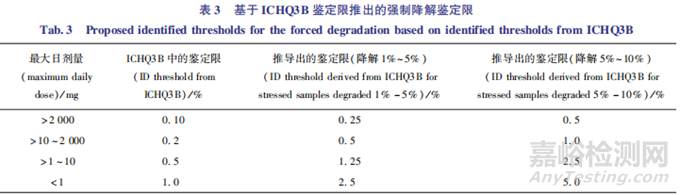 該判定方法具有階段性,規(guī)定了不同申報(bào)階段的判定標(biāo)準(zhǔn)。 例如,某原料藥在申報(bào)臨床試驗(yàn)申請( investigational new drug, IND) 階段,在光照條件下降解 了4.46% , 分 別 為 雜 質(zhì)A(0.8% ) 、 雜 質(zhì)B(3.0% ) 、雜質(zhì)C(0.02% ) 、雜質(zhì) D(0.04% ) 、雜質(zhì)E(0.1% ) 和 雜 質(zhì) F( 0.5% ) 。雜 質(zhì) C、 D、E的 含量 <0.25% ,直接不作為主要降解產(chǎn)物;雜質(zhì) A、F分別占 總 降 解 產(chǎn) 物 的17.9% (0.8% ÷ 4.46% ) 、11.2% (0.5% ÷ 4.46% ) ,大于表中的上限10% ;另外,2 個(gè)雜質(zhì)的含量分別為最大降解產(chǎn)物的26.7%(0.8% ÷ 3. 0% ,大于限度25% )和 16.7% (0.5% ÷3.0% ,小于限度25% ),所以雜質(zhì)f不應(yīng)視為主要降解產(chǎn)物,故雜質(zhì)A、B為主要降解產(chǎn)物,應(yīng)進(jìn)行結(jié)構(gòu)確證;但當(dāng)該藥物進(jìn)行NDA申報(bào)時(shí),雜質(zhì)F應(yīng)進(jìn)行鑒定(16.7% ,大于限度10% )。另一種方法將ICHQ3A、3B中的鑒定限與強(qiáng)制降解的鑒定限進(jìn)行了關(guān)聯(lián),一般僅針對高溫固體降解試驗(yàn)。該判定方法的大致原理:首先,假定高溫固體降解試驗(yàn)與加速條件40℃ /75% RH 放置6個(gè)月達(dá)到了動(dòng)力學(xué)平衡;其次,保守估計(jì)若藥物在貨架期內(nèi)降解了 2% ,如在強(qiáng)制降解試驗(yàn)中應(yīng)降解5% ~10% ,經(jīng)計(jì)算,后者是前者的2.5~5倍,取其中較大的倍數(shù)5。當(dāng)以ICHQ3B中的鑒定限為基數(shù)再乘以相應(yīng)的 5倍時(shí),則可以推導(dǎo)出強(qiáng)制降解中的鑒定限(表 3)。