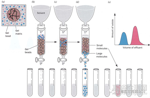 在檢測時,樣品進入進樣器后被淋洗溶劑帶入凝膠色譜柱,讓被測量的高分子化合物溶液通過一根內裝不同孔徑的色譜柱,柱中可供分子通行的路徑有粒子間的間隙(較大)和粒子內的通孔(較小)。當聚合物溶液流經色譜柱(凝膠顆粒)時,較大的分子(體積大于凝膠孔隙)被排除在粒子的小孔之外,只能從粒子間的間隙通過,速率較快;而較小的分子可以進入粒子中的小孔,通過的速率要慢得多;中等體積的分子可以滲入較大的孔隙中,但受到較小孔隙的排阻,介乎上述兩種情況之間。