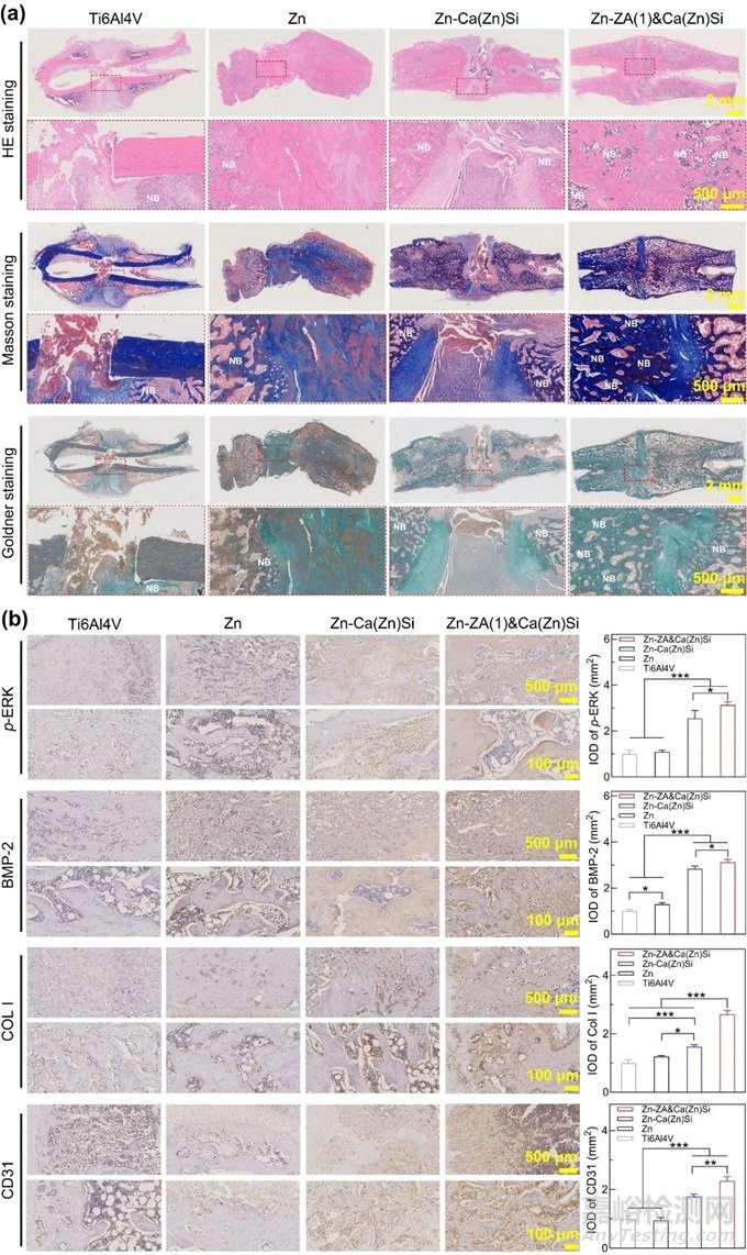 通過H&E、Masson、Goldner和免疫組織化學(xué)染色評估骨再生。H&E染色顯示Ti6Al4V組中有一條清晰的骨折線。在純 Zn組中,由于髓內(nèi)釘過早骨折導(dǎo)致骨折愈合不良,出現(xiàn)大量新形成的纖維組織。Ca(Zn)Si改性的髓內(nèi)釘這組也出現(xiàn)骨折線。相比之下,ZA&Ca(Zn)Si組表現(xiàn)出相對不明顯的骨折線,靠近骨折部位的膠原蛋白分化為新的小梁骨,表現(xiàn)為紫色的蜂窩狀組織,表明愈合狀態(tài)良好。Masson染色顯示, Ti6Al4V組的骨折部位處幾乎沒有新形成的膠原蛋白。在純 Zn組中,斷裂末端由豐富的膠原纖維連接。Ca(Zn)Si改性的髓內(nèi)釘組發(fā)現(xiàn)部分礦化膠原蛋白。ZA&Ca(Zn)Si改性髓內(nèi)釘組染成深紅色,表明更多的礦化骨形成。Goldner染色顯示了類似的結(jié)果,與其他三組相比,ZA&Ca(Zn)Si改性髓內(nèi)釘組有更多的礦化新骨染成綠色,這意味著骨愈合更好(圖9)。