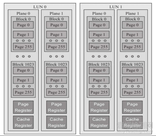 閃存芯片內部分為LUN(邏輯單元), PLANE(平面), BLOCK(區塊), PAGE(頁);一個封裝好的閃存芯片可能包含若干個LUN(邏輯單元);一個PLANE(平面)就是一個存儲矩陣,包含若干個BLOCK(區塊);BLOCK(區塊)是閃存的最小擦除單位,一個BLOCK(區塊)包含了若干個PAGE(頁);PAGE(頁)是閃存的最小讀寫單位,一個PAGE(頁)包含若干個BYTE(字節)。