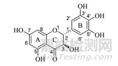 二氫楊梅素是顯齒蛇葡萄中最主要的黃酮類成分(結構式如下圖所示,來源文獻[3]),具有抗氧化、抗炎、抗病毒、抗癌、抗菌、抗疲勞、抗焦慮、降糖、保肝護肝、心臟保護、緩解阿爾茨海默病和緩解哮喘等作用,其安全性良好,大鼠與小鼠的急性口服毒性試驗、長期毒性試驗和基因毒性試驗結果均為陰性。二氫楊梅素可制成片劑及膠囊用于解酒護肝;可作天然抗氧化劑以延緩衰老及保存食品;可作動物飼料的添加劑以增加肉質和縮短生長周期。二氫楊梅素的穩定性明顯弱于其他黃酮類化合物,因為其具有6個羥基,特別是B環的羥基容易氧化,pH≥9、高溫及光照均可加速其氧化,此外,腸黏膜通透性較低、體內半衰期短、藥理活性不高及易變色等問題也限制了其開發利用。