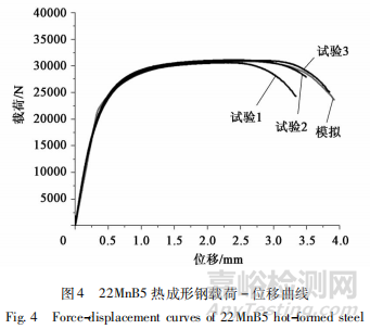 (3)采用建立的硬化模型及斷裂模型進行仿真分析并與試驗結果進行對比,脹形試驗中試驗與仿真的載荷-位移曲線吻合較好,峰值載荷相對誤差為3.02% ; B柱的三點靜壓試驗中,采用建立的材料模型分析獲得零件開裂位置與試驗結果一致,二者的峰值載荷最大相對誤差為3.06% ,表明建立的材料模型可以準確表征22MnB5 熱成形鋼的塑性變形行為及斷裂失效行為。