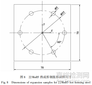 利用脹形試驗對材料斷裂模型進行應用驗證,試樣尺寸如圖8所示,試樣周邊以螺栓固定,采用Φ10mm 的沖頭以5mm·s-1的速度下壓試樣直至破裂。