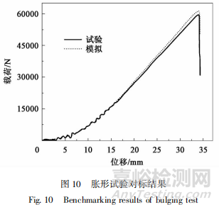 按照實際試樣尺寸和試驗過程中的邊界條件對脹形試驗進行有限元模擬,圖9為試驗和有限元仿真結果對比圖,結果顯示 Gissmo模型可以大致模擬出裂紋的產生和擴展情況。對穿孔過程的載荷-位移曲線進行仿真模擬,模擬的邊界條件與試驗過程一致。圖10為試驗與仿真過程中的載荷-位移曲線對比,試驗的峰值載荷為59186N,模擬的峰值載荷為60972N,相對誤差為3. 02%,說明Gissmo斷裂失效模型能夠有效預測脹形試驗過程的斷裂失效。