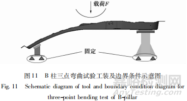 作為車身上重要的安全結構件,B柱的抗彎性能在整車安全性能評價中十分重要。為考察B柱的抗彎性能,本文通過三點彎曲試驗和仿真考察B柱的彎曲性能和斷裂模式,試驗工裝及邊界條件如圖11所示。