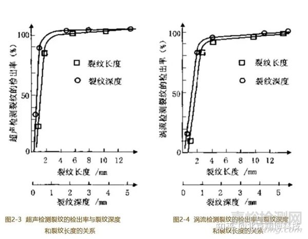 圖2-1至圖2-4展示了射線檢測、滲透檢測、超聲檢測和渦流檢測等方法對裂紋的檢出率。