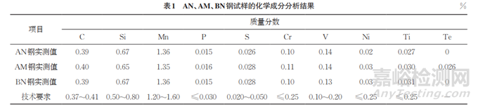 對38MnVS 鋼進行碲改質處理,試樣編號為AM,未改質處理的60mm(直徑)熱軋棒材編號為AN,比AM鋼具有更大壓縮比的60mm(直徑)熱軋棒材編號為BN,這3種材料的化學成分分析結果如表1所示。由表1可知:AM、BN鋼中Ni元素含量大于技術要求;3種鋼的Ti元素含量均大于技術要求。