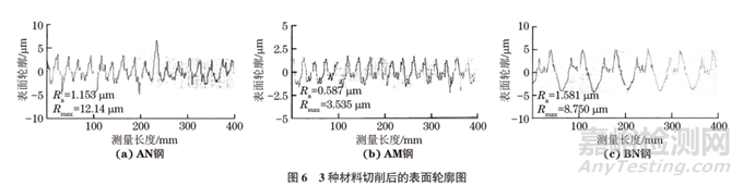 3種材料切削后的表面輪廓圖如圖6所示,根據輪廓圖計算出對應輪廓的最大高度Rmax。AM鋼的表面粗糙度最低,為0.587μm;AN鋼的表面粗糙度為1.153μm;BN鋼的表面粗糙度為1.581μm。說明碲改質可降低38MnVS 鋼切削后的表面粗糙度。