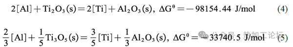 對比分析Al-Ti脫氧體系下的兩組結果,發現兩組鋼中均未明顯觀察到TiOX,這是因為Al與O的親和力要強于Ti,先加入Al時,Al和鋼液中的O反應生成Al2O3,當鋼液中有足夠的溶解Al時,鋼液中的O與Al平衡,受Al控制,使得O 幾乎不與Ti反應結合生成Ti的氧化物。此外,在先加Ti后加Al時,鋼中最先生成少量TiOX,但隨著Al的加入,O更易與Al結合,鋼液中的復雜脫氧反應向著生成Al2O3這種更穩定相的方向進行,且還存在少量Al向著TiOX奪O的反應,導致鋼中最先生成的TiOX變少,使得鋼中最終穩定存在的氧化物相為Al2O3,其機理如(1)-(5)式所示。由式(4)、(5)可知,因此不論Al、Ti的加入順序如何,鋼中最穩定的相應為Al2O3,這與實驗表征結果一致。