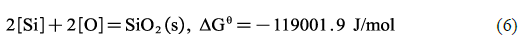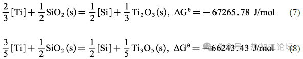 在Si-Ti復合脫氧的兩組實驗中,含Ti 夾雜物主要是Ti-O-N系復合夾雜。通過對比T3的結果還可以看出,Ti、Si 加入順序的變化導致T4中的含Ti 夾雜物尺寸要明顯比T3小。此外,在先加Si 后加Ti 時,鋼中雖然出現了大量TiOX-TiN 復合夾雜,但未出現SiO2,這與T3的表征結果產生了明顯的差異。這是因為在1600℃時,在T3實驗鋼中,Ti首先脫去了鋼中大部分的O,殘余O與后加入的Si 形成了少量了SiO2,此時鋼中剩余的少量溶解Ti與SiO2發生如式(7)、(8)的反應,但由于剩余的Ti含量過少,不能完全將SiO2轉化為Ti的氧化物,所以最終形成了SiO2-TiOX的復合結構。而在T4中,先加入的Si與O先反應生成SiO2,其反應的Gibbs自由能如式(6)所示,后加入Ti時,鋼中發生如式(2)、(3)所示的反應。結合式(2)、(3)和(6)可得到式(7)、(8),由式(7)、(8)可知,因此在后加入Ti時,鋼中的最穩定相由SiO2轉變為TiOX,這與實驗表征的結果一致。因此,Si、Ti的加入順序不僅影響了鋼中含Ti夾雜物的尺寸,更影響了種類。