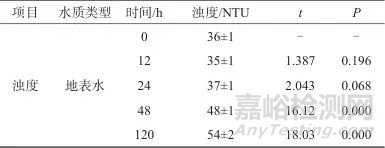 地下水電導率在保存時間為6 h時分析結果為(2 647±21) μS/cm,12 h分析結果為(2 677±18) μS/cm,6 h與12 h分析結果基本一致;在保存時間為24 h時分析結果為(2 727±8) μS/cm,與6 h分析結果顯著性差異(P<0.05),因此電導率在12 h內分析結果相對穩定。地表水濁度在6 h時結果為(36±1)NTU,在48 h時結果為(48±1)NTU,與6 h內結果顯著性差異(P<0.05),可至少保存24 h[(37±1)NTU,P>0.05]。廢水總固體第一時間分析結果為(260±5) mg/L,48 h時結果顯著性差異[(286±5) mg/L,P<0.05],可至少保存24 h [(262±4) mg/L,P>0.05]。冷卻水堿度在6 h時結果為(186±1) mg/L,72 h時結果為[(185±1) mg/L,P>0.05],與6 h結果不存在顯著性差異,可保存至少72 h。