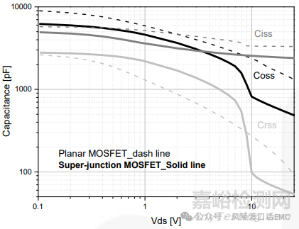 超結MOSFET的輸入電容和米勒電容都顯著降低,輸出電容曲線相差不大,差別主要是更高的非線性程度,平面MOSFET與超結MOSFET的電容曲線對比如下圖所示: