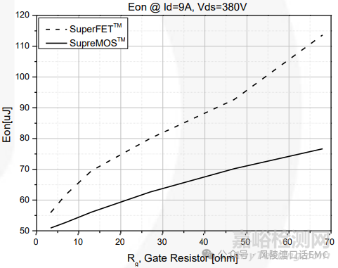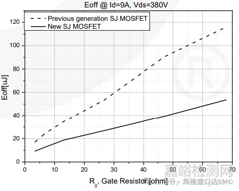 超結MOSFET的CISS電容的線性基本保持,CRSS和COSS表現出很強的非線性,CRSS在約10V漏源極電壓處迅速降低,電容非線性導致極強dv/dt與di/dt。快速開關降低開關損耗,同時也有負面效應,增加EMI風險、柵極振蕩、較高的漏源極電壓峰值,控制最大開關速度對于獲取不帶負面效應的超極結MOSFET極端性能來說非常的重要。