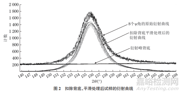 X射線應力檢測設備探測器的衍射角覆蓋范圍是重要的技術參數,原則上應該能保證得到完整的衍射峰,即衍射峰前后尾部與背底線呈相切的趨勢。在滿足完整要求的情況下,若實施標準側傾法,則不同ψ角的衍射峰背底理論上是一致的,斜率很小;采用同傾法時,衍射峰背底斜率隨ψ角的增大而增大(見圖1)。