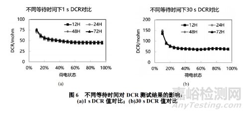 實驗室測試條件下,DCR測試通常被要求安排在電芯Fresh態或壽命測試過程中,以獲取電芯不同老化程度對應的DCR值是否滿足規格判定。從壽命測試暫停到DCR測試開始期間的等待時間往往受限于人力、設備資源等原因,不盡相同,對DCR測試結果可能產生以下影響: