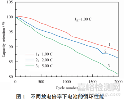 實(shí)驗(yàn)在數(shù)據(jù)中心用電池的基礎(chǔ)上展開,該電池的倍率循環(huán)性能見圖1。從圖1可知,相同倍率充電,2.00C放電和5.00C放電循環(huán)2000次,容量分別衰減14%和20%,相對1.00C放電循環(huán)衰減12%,分別低2個(gè)和8個(gè)百分點(diǎn)。從循環(huán)性能上看,電池具有倍率長循環(huán)的特點(diǎn)。