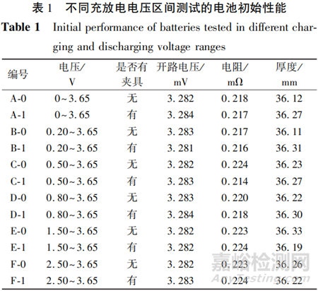 為研究鋁殼電池在不同電壓區(qū)間的過放電特點(diǎn),對電池進(jìn)行持續(xù)的循環(huán)測試,變量為電壓區(qū)間和電池循環(huán)過程中所處的狀態(tài):有夾具、無夾具。 分別將電池進(jìn)行編號,變化內(nèi)容以及電池的初始狀態(tài)見表1,電池的荷電狀態(tài)(SOC)為30%。從表1列舉的12組電池30% SOC下初始電壓、內(nèi)阻、厚度看,實(shí)驗(yàn)用電池的一致性較好。