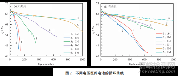 通過對電池施加有夾具和無夾具的2種預(yù)緊力,在 0~3.65V、0.20~3.65 V、0.50~3.65V、0.80~3.65V和1.50~3.65V,以及常規(guī)的2.50~3.65V等6個(gè)電壓區(qū)間循環(huán),不論是否有夾具,電池的放電截止電壓越低,容量衰減越迅速。在實(shí)際應(yīng)用中,應(yīng)盡量避免長時(shí)間的過低電壓循環(huán),以延長電池的使用壽命。