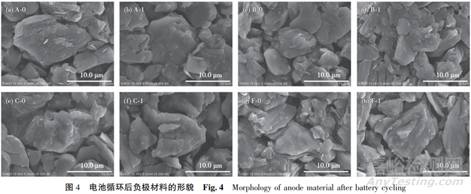 對負(fù)極片進(jìn)行XRD分析,結(jié)果如圖6所示。從圖6可知,雖然電池在不同電壓區(qū)間循環(huán),但循環(huán)后的負(fù)極材料仍是石墨,并未產(chǎn)生其他新的物質(zhì)。在同一電壓區(qū)間,無夾具電池的負(fù)極極片(002)、(100)等特征峰都向低角度平移,說明石墨的晶胞參數(shù)變大,晶面間距變大。