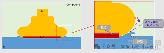 當水汽攜帶著Cl離子、氧氣沿Wire bonding產生的擠鋁中進入時,同時與Al層、IMC層、Au層發生接觸,Au屬于惰性金屬,很難發生腐蝕,因此我們只需要考慮Al和IMC的腐蝕即可。