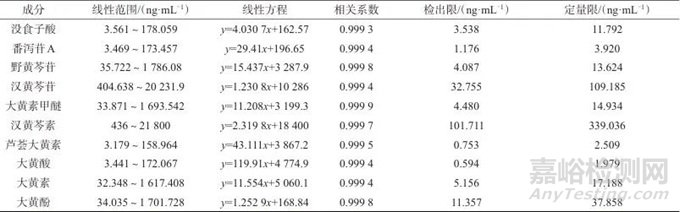 表 3 10種中藥活性成分的的線性范圍、線性方程、相關系數、檢出限和定量限