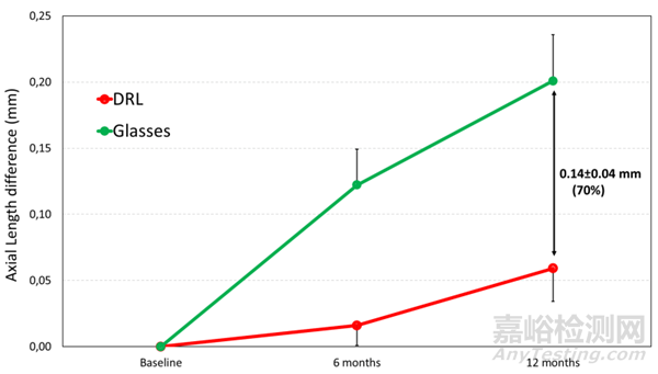 研究結(jié)果:25名患者組成了 DRL Night 組,23名在對(duì)照組(單光眼鏡組)。與單光眼鏡組相比,DRL Night 治療在6個(gè)月和12個(gè)月的鏡片佩戴后分別導(dǎo)致眼軸延長(zhǎng)減少了86%和70%。
