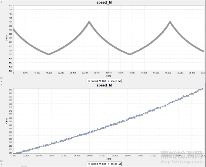 基于以上的方案,通過定時器模擬生成編碼器輸出信號A和B,分別的高速和低速情況下進行模擬測試,結果如下,圖中Speed_M_Ref和Speed_T_Ref為速度參考值,Speed_M和Speed_T為測試結果值。