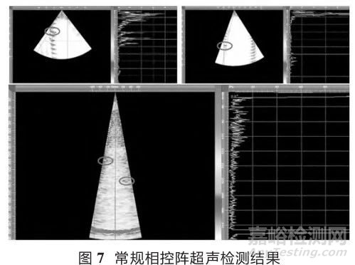 對螺栓進行超聲缺陷檢測時,將超聲探頭直接貼合在涂滿耦合劑的檢測端面,然后通過旋轉探頭角度觀察檢測結果圖像,確定螺栓狀態,超聲檢測結果為平行于探頭方向的豎直扇形掃描內部成像,由于缺陷的位置不在同一豎直線上,因此需要探頭旋轉到不同的角度才能檢測到不同的缺陷,具體檢測結果如圖7和圖8所示。