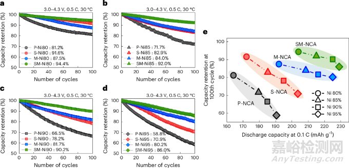 首先研究不同鎳含量的P-NCA正極材料 (Li[NixCoyAl1−x−y]O2,x=0.80~0.95) 在ASSBs中的容量衰減機(jī)制。并通過(guò)表面涂覆硼酸 (S-NCA)、摻雜鈮 (M-NCA) 以及兩者的協(xié)同改性(SM-NCA),優(yōu)化了正極材料的界面穩(wěn)定性和微觀結(jié)構(gòu) (圖1)。結(jié)果表明,硼酸涂層可抑制界面副反應(yīng),而鈮摻雜使一次顆粒呈徑向排列的棒狀結(jié)構(gòu),有效緩解鋰化過(guò)程中的應(yīng)力集中,抑制微裂紋形成。與Li6PS5Cl SE組裝的ASSBs電化學(xué)測(cè)試結(jié)果顯示,SM-NCA正極材料在0.5 C下循環(huán)100次后表現(xiàn)出最高的容量保持率,歸因于表面和微觀結(jié)構(gòu)改性的協(xié)同效應(yīng)。此外,發(fā)現(xiàn)改性效果與Ni含量密切相關(guān),高Ni含量時(shí)M-NCA和SM-NCA的性能提升更為顯著 (圖2)。