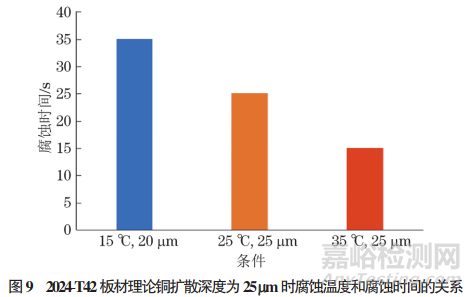 2024-T42板材理論銅擴散深度為25μm時腐蝕溫度和腐蝕時間的關系如圖9所示。由圖9可知:15℃腐蝕35s、25℃腐蝕25s、35℃腐蝕15s測得的銅擴散深度基本相當,且與能譜法檢測結果基本一致。