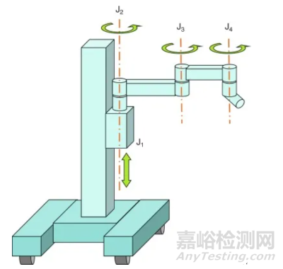 下圖展示了達芬奇系統的最初4個自由度(DoF)。電動驅動的棱柱關節J1允許根據患者身高調整臂的高度。關節J2、J3、J4形成一個SCARA被動臂,并配有強力剎車,一旦臂正確就位即可鎖定它們。