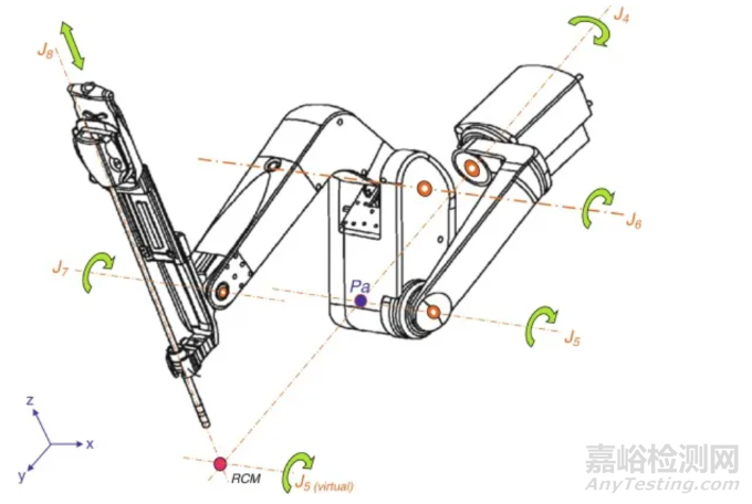 下圖展示了達芬奇系統的主要結構。旋轉驅動關節J4、J5共享同一軸Pa,而被動關節J6、J7的旋轉復制J5的角運動到工具支架。因此,J5的作用就像位于RCM點一樣。J8是一個棱柱關節,確保在RCM點為中心的平移。棱柱關節J8由多個堆疊的滑塊通過纜繩和滑輪驅動。最終,達芬奇®系統主體由三個主動關節組成:工具軸向平移以及圍繞患者進入點RCM的兩個正交旋轉。